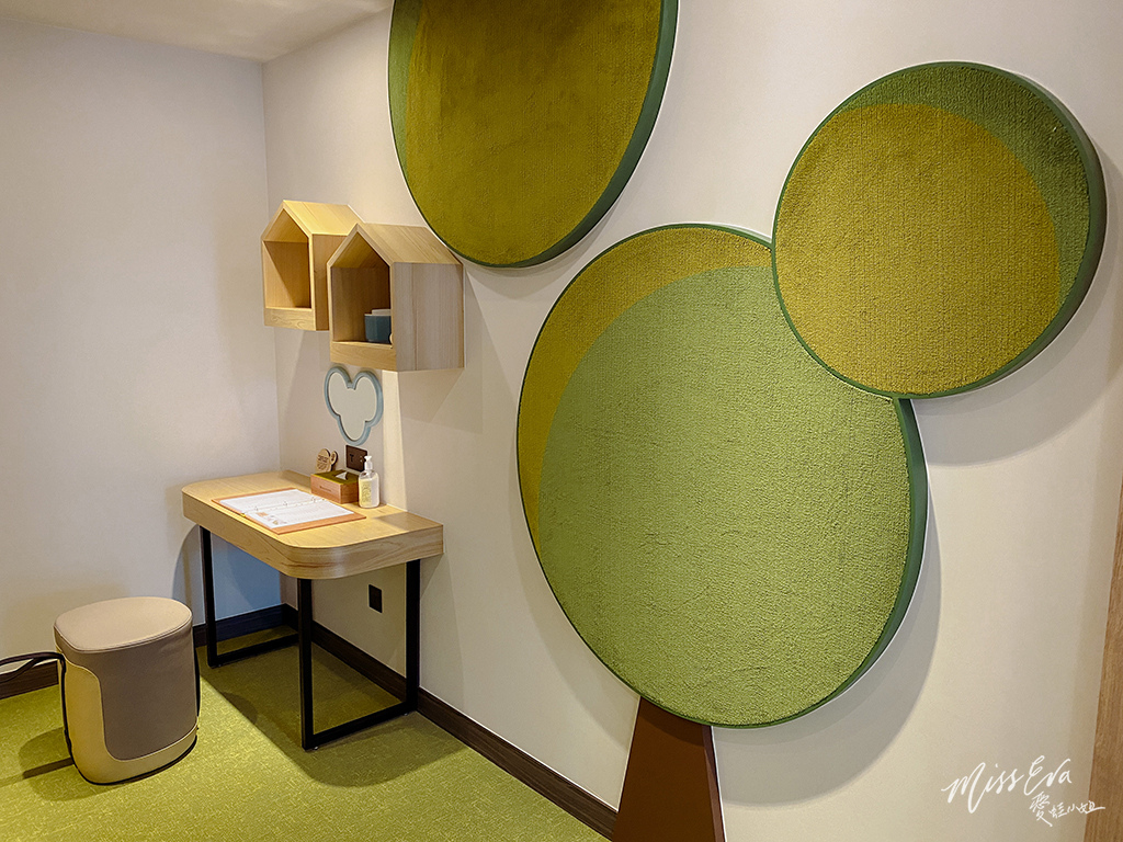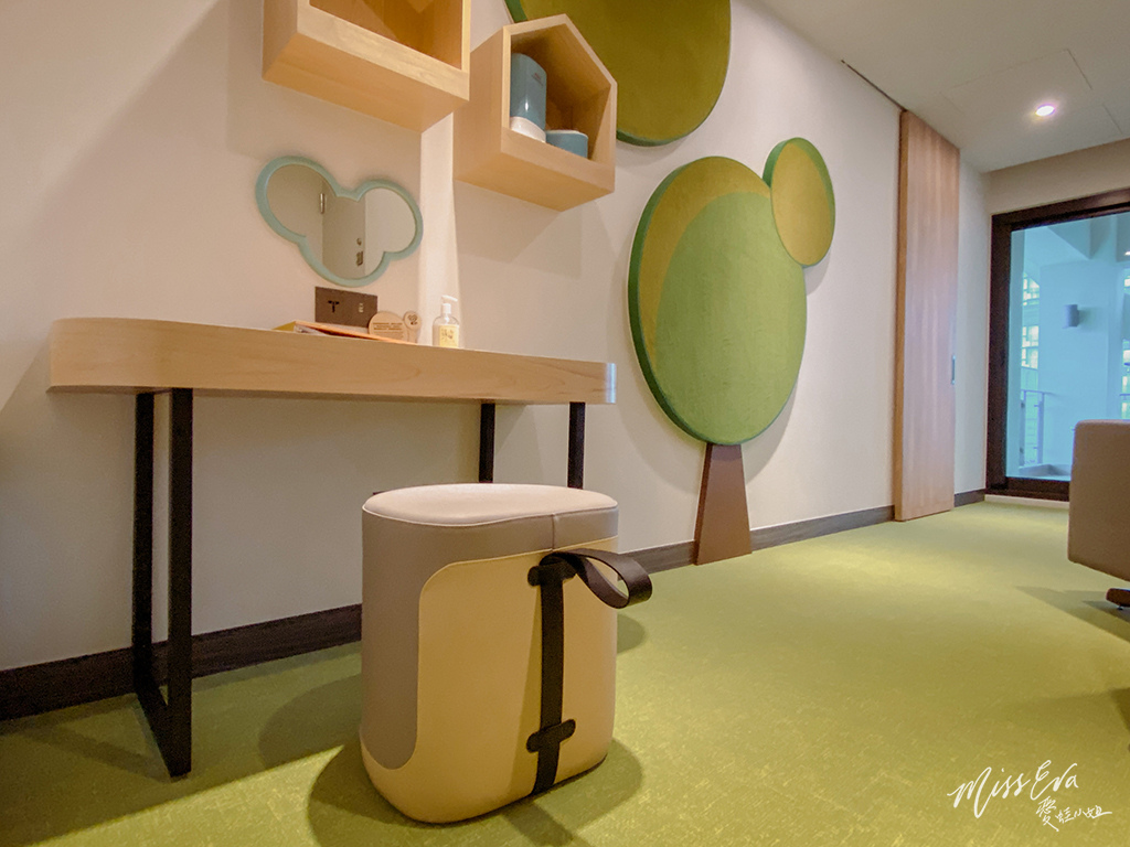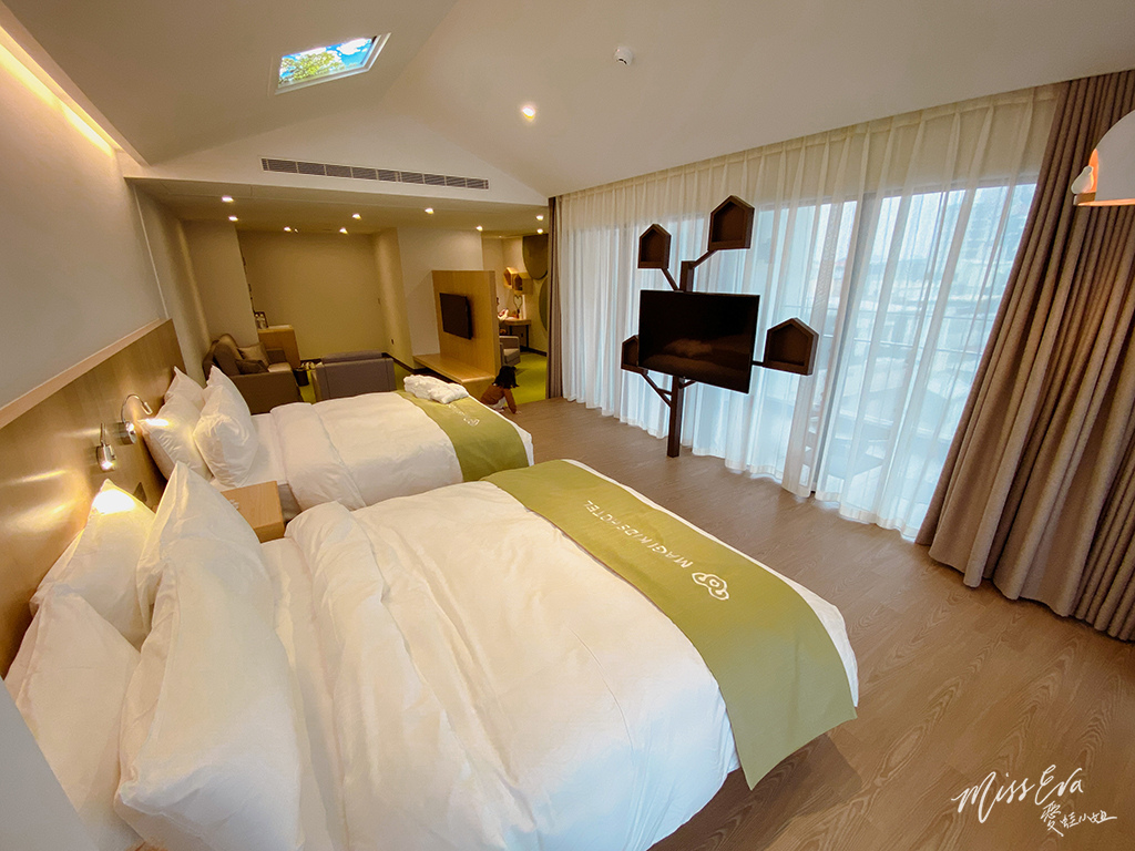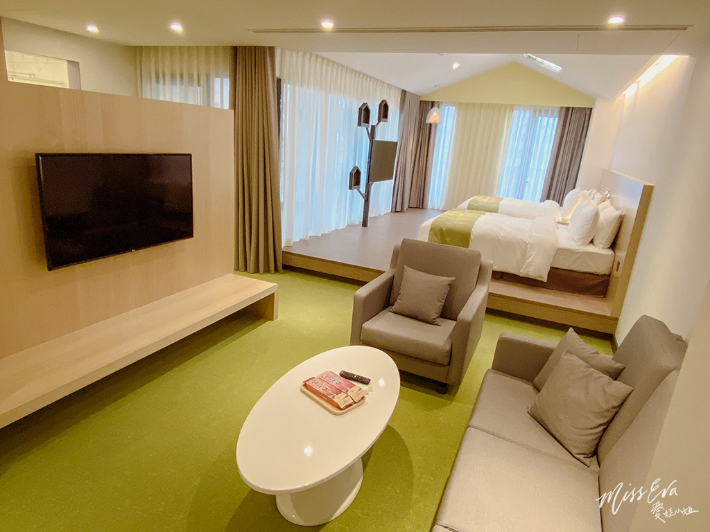 ▼房間內寬敞,綠色和木頭色的搭配營造出很放鬆的氛圍