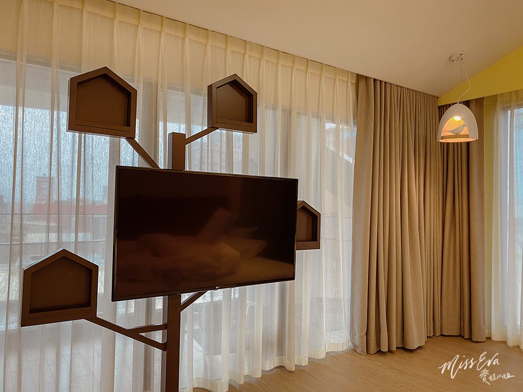 ▼電視牆面的設計也結合了樹屋的巧思